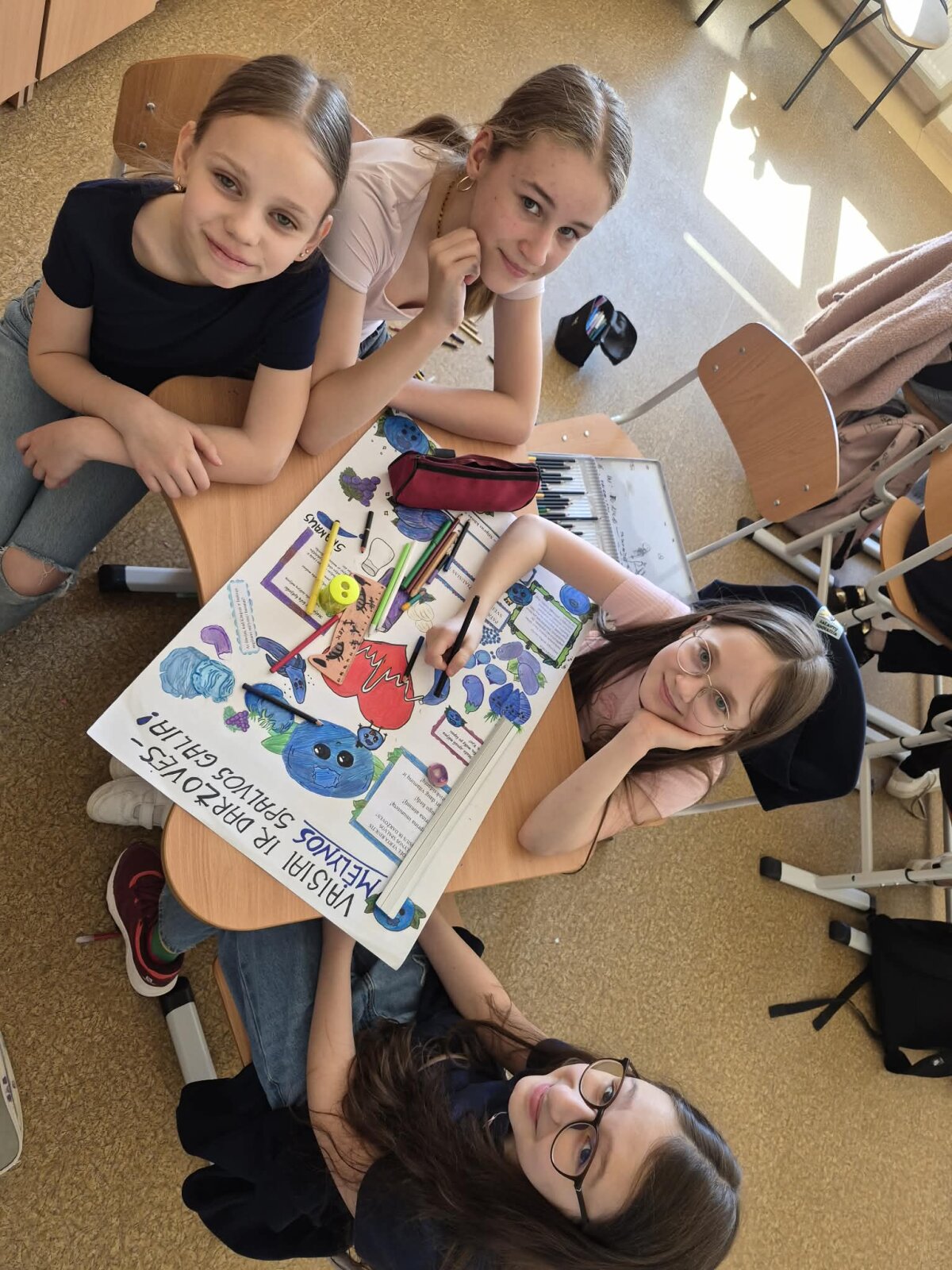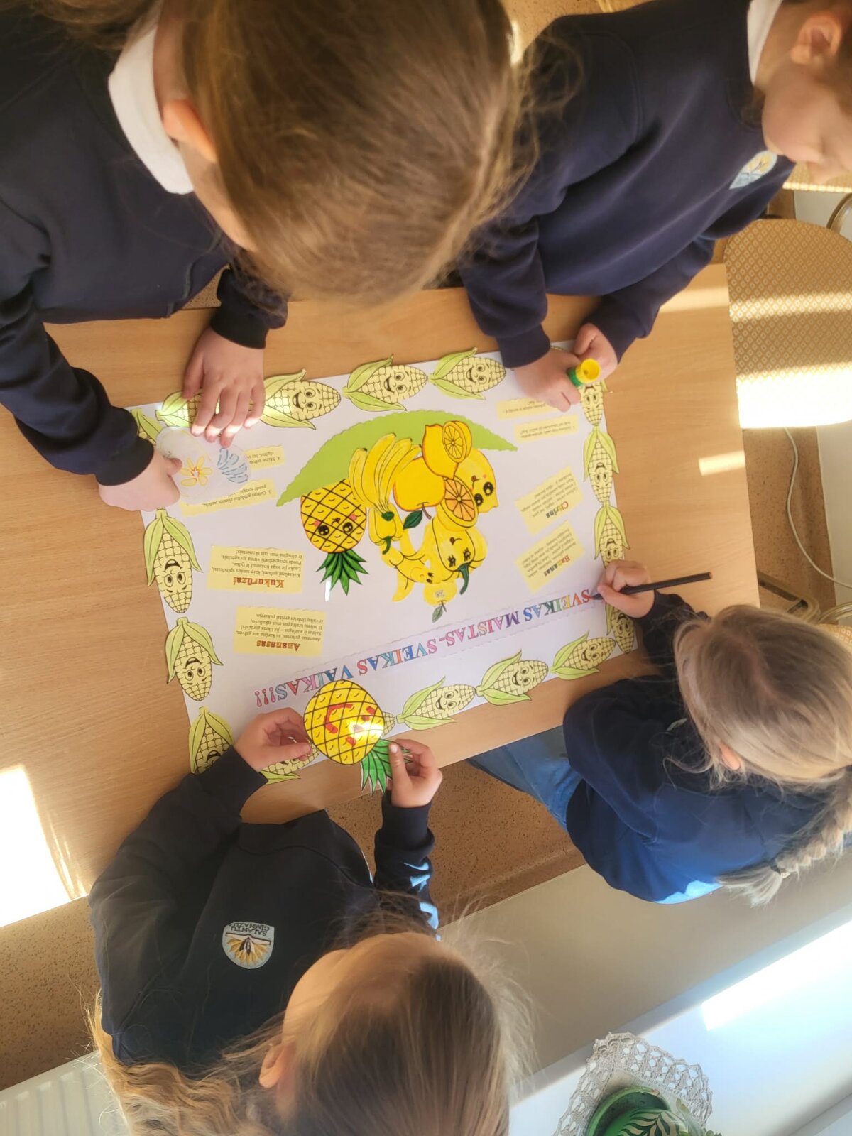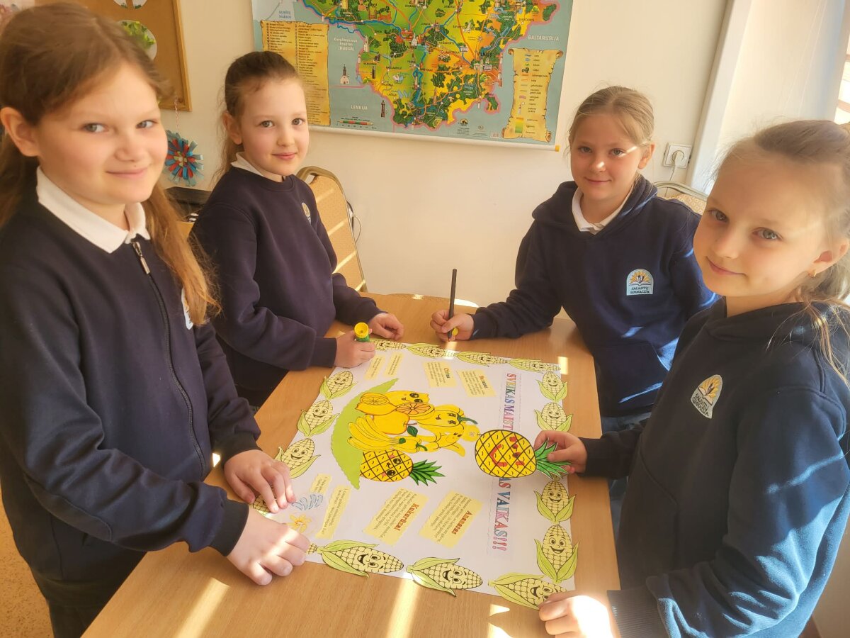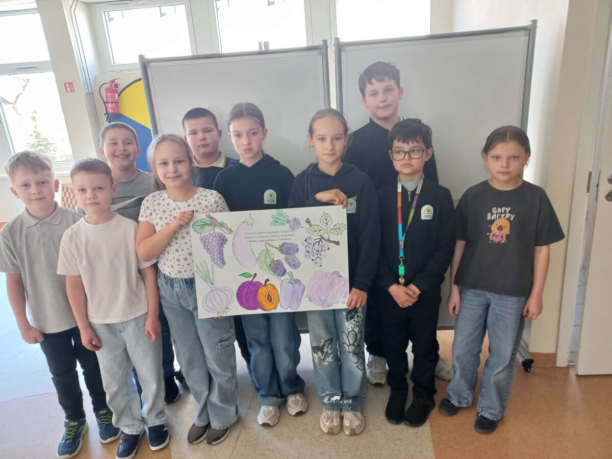 Kiekviena klasė išsitraukė spalvą. Pagal tą spalvą turėjo surasti vaisius ir daržoves, apibūdinti jų svarbą ir naudą žmogaus organizmui. Projekto metu vaikai dalyvavo įvairiose kūrybinėse, pažintinėse ir praktinėse veiklose, kūrė daržovių ir vaisių plakatus. Projektas suteikė vaikams ne tik naujų žinių, bet ir paskatino juos rinktis sveikesnius užkandžius, domėtis gamta bei jos teikiamais turtais, padėjo suprasti, kaip svarbu rūpintis savo sveikata, maitintis įvairiai ir kasdien įtraukti į racioną šviežių daržovių, vaisių ir uogų. Tokios veiklos ugdo smalsumą, savarankiškumą ir atsakomybę už savo sveikatą.